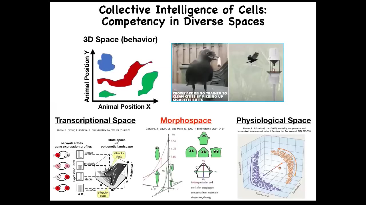 There are many different spaces: the space of gene expression, which is a very high-dimensional space; the space of physiological states; and anatomical morphospace, which is the space of possible anatomical configurations of a particular structure.