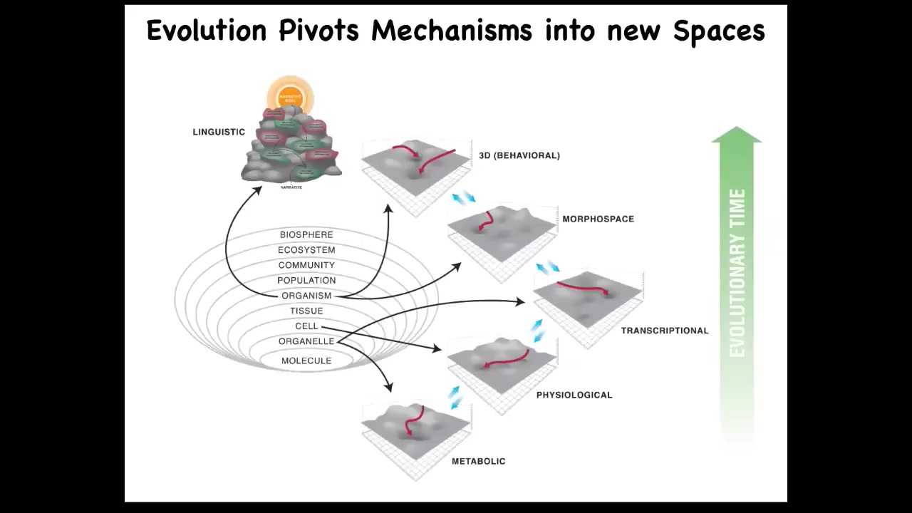 What I think is that evolution pivots some of the same tricks, these tricks being navigational competencies across all of these spaces as we went from very simple prebiotic states to early life and then eventually to a linguistic space in humans. But I'm going to focus on this today, the anatomical morphospace.