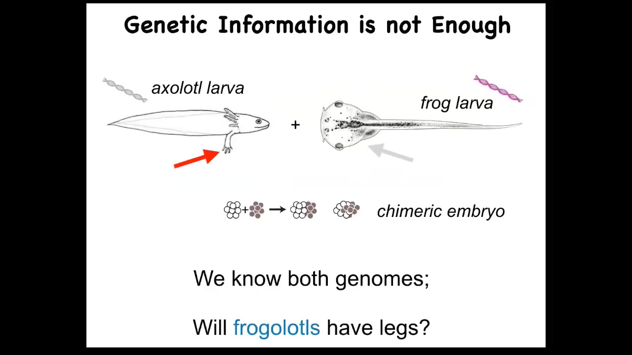 Now I ask a simple question. Well, you've got the axolotl genome; it's been sequenced. You've got the frog genome; it's been sequenced. You know exactly what the genetic material is. You know what the specification of the cellular hardware is. Can you tell me if a frogolotl is going to have legs or not? The answer is no: we have no models that will predict from genetic information what this chimera is going to do.