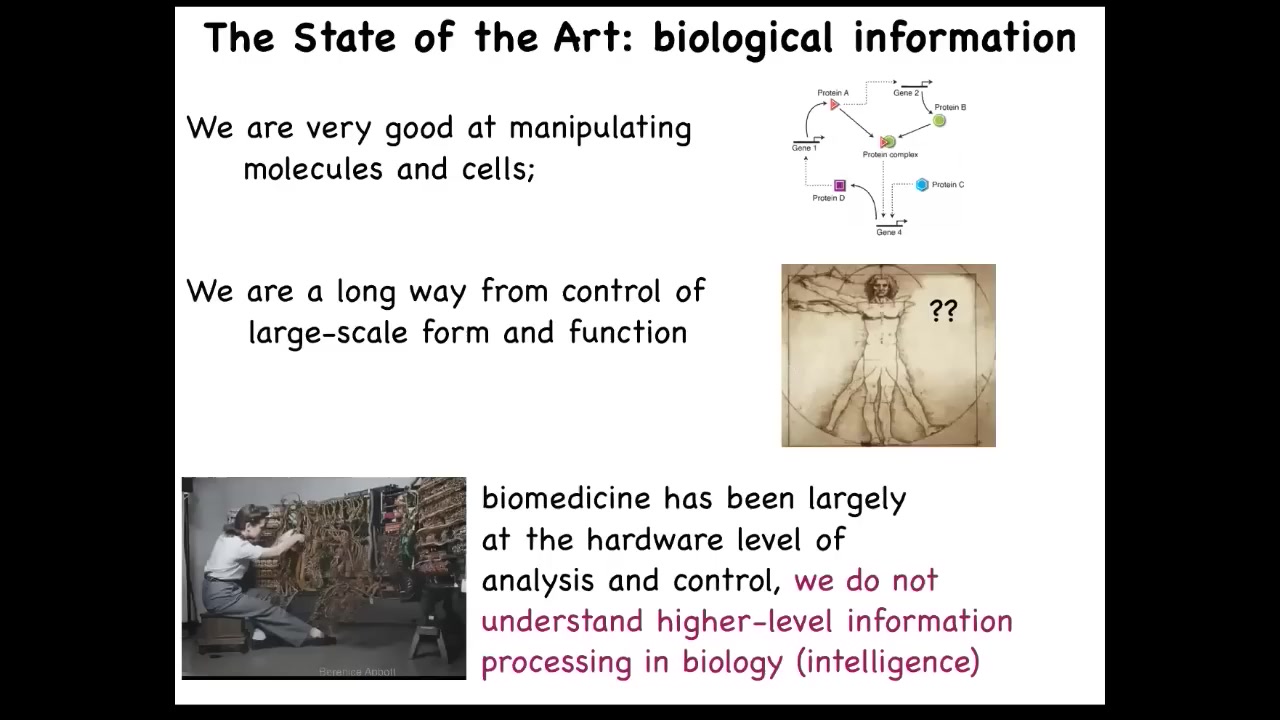 And that's because we have lots of methods and strategies for getting information like this or molecular-level information, what's going on at the lowest hardware level. We're a very long way away from understanding collective decision-making, how large groups of cells make their decisions about what they're going to build. And I think that's because currently, biology and molecular medicine are where computer science was in the 40s and 50s. So originally, in order to program, you had to physically rewire the machine. So you had to be there directly interfacing at the hardware.