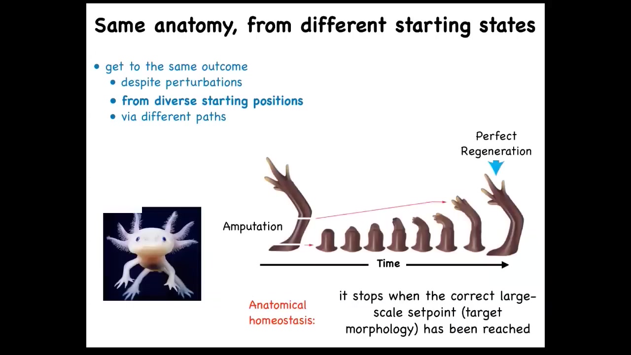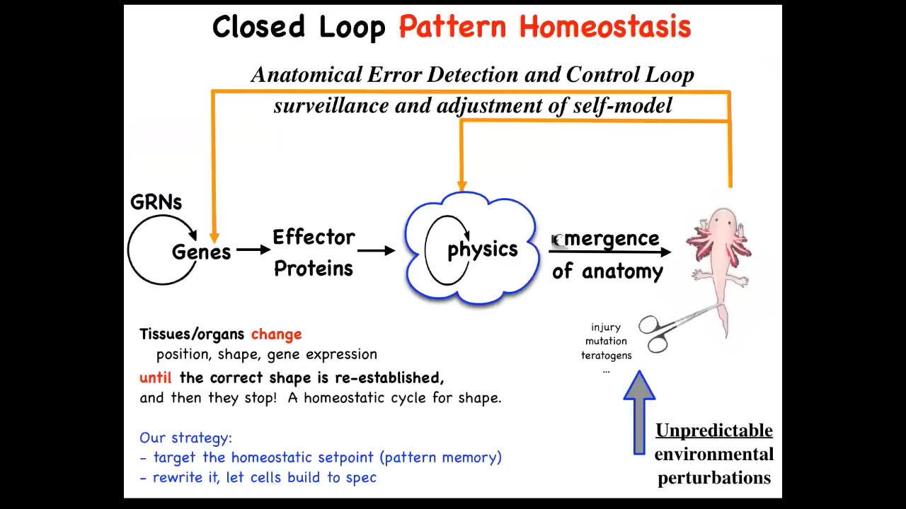 There are a few interesting things here. First of all, in a typical homeostatic loop that biologists are familiar with, so hunger level, pH, things like that, temperature, things like that, the set point of this process, and every homeostatic process has to have a set point. The set point of this process is a scalar, it's a single number. But here, that's not going to work. You need some kind of large data structure, a descriptor, an anatomical descriptor that allows the system to minimize the distance from it. That's kind of odd. You might ask yourself, how could you store such a thing in biological tissue? Where is it? How do you store it?