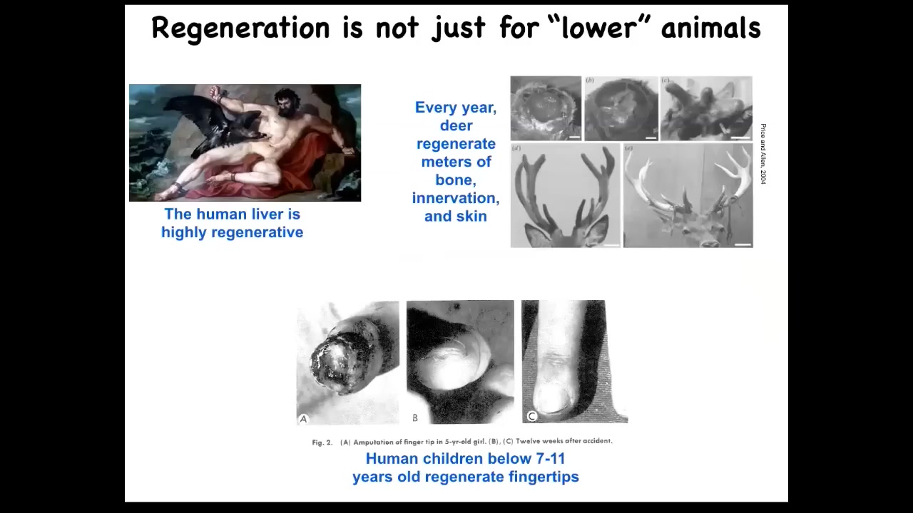 That doesn't stop at embryogenesis in some animals like this salamander. They regenerate throughout their lifespan. These axolotls regenerate lots of different body parts. For example, the limb you can amputate at any position. It builds exactly what's needed to build a perfect salamander limb. They regenerate their eyes, their jaws, their tails, including spinal cord, ovaries.