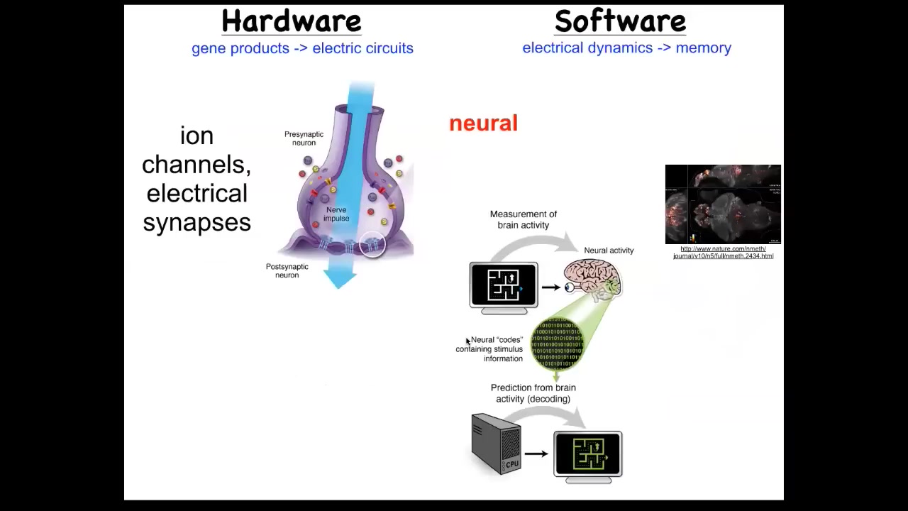 What you're looking at here is a living zebrafish brain. This group made an amazing video of the activity of a living fish brain. There's this notion of neural decoding, which is that if we were to understand and decode all of the information in this electrophysiology, we would be able to read the creature's memories, its preferences, behavioral repertoires, and so on. That's the commitment of neuroscience: that all of the cognitive content is stored in this electrophysiology.