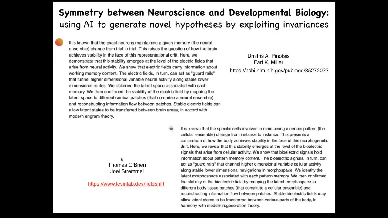 And the idea is that there's this profound kind of invariance between neuroscience and developmental biology. In traditional neuroscience, the electrical activity of the neurons in your brain, the software, is giving directions to muscles. It's controlling muscles to move you through three-dimensional space. That's a pretty cool trick. Where did it learn that trick? Evolution learned this around the time of bacterial biofilms, very early on.
