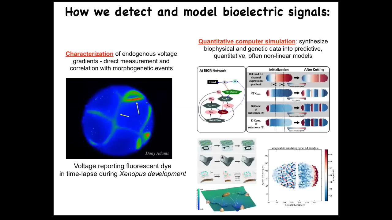 First, it's voltage-sensitive fluorescent dyes. What you're seeing here is a time lapse of an early frog embryo, where we can see all the electrical conversations that all these cells are having with each other. We get to read the voltages, and then we do simulations. We have this simulator, and we do work to try to understand how the molecular biology of the ion channels gives rise to electrical circuits that have specific behaviors.