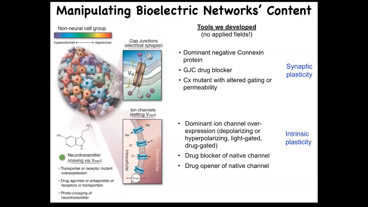 What we did years ago was to build the first molecular tools for reading and writing electrical information in non-neural cells. We appropriated from neuroscience because those tools can't tell the difference. They work everywhere. They're not specific for neurons.