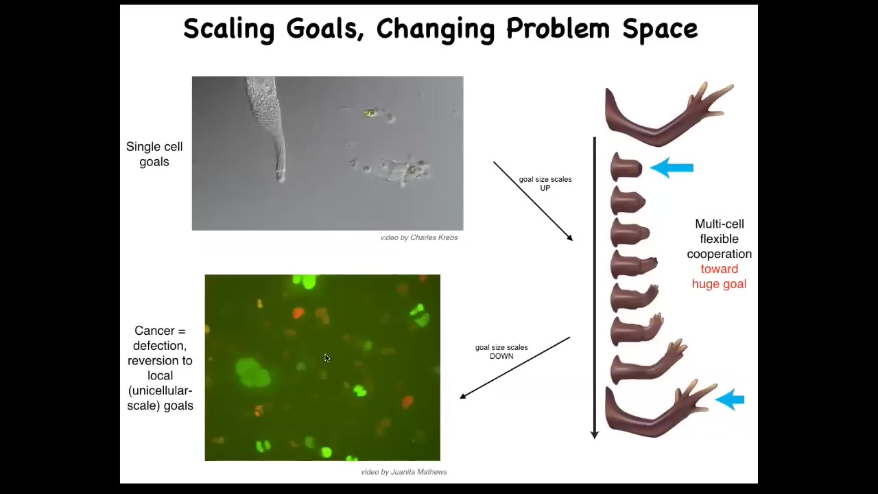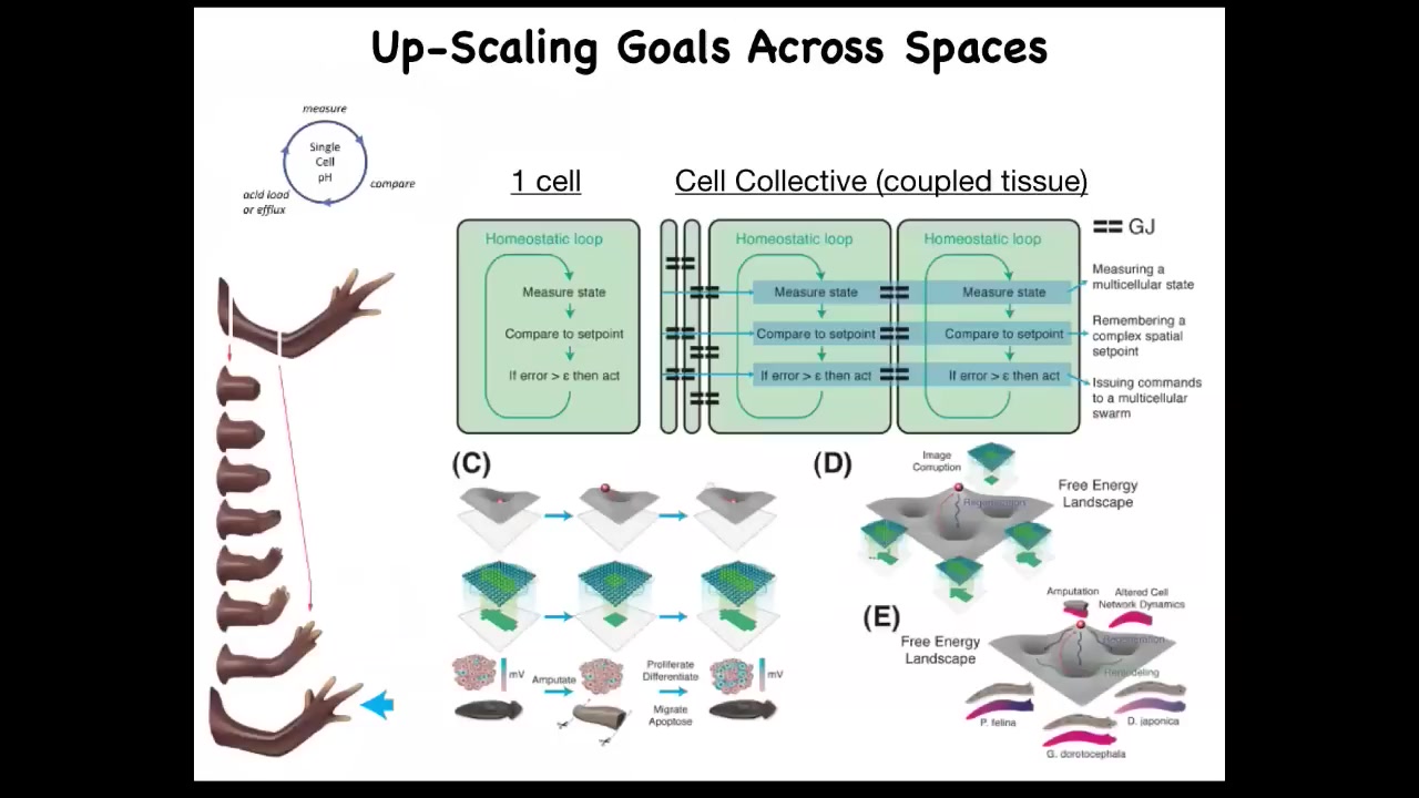 So what you need to do is scale. You have to use communication between these cells to scale them to larger-scale goals, enlarge that cognitive light cone so that the set points that they're going after are much bigger and in a different space, and they're able to recover from partial information and navigate these energy landscapes.