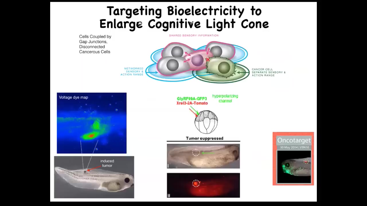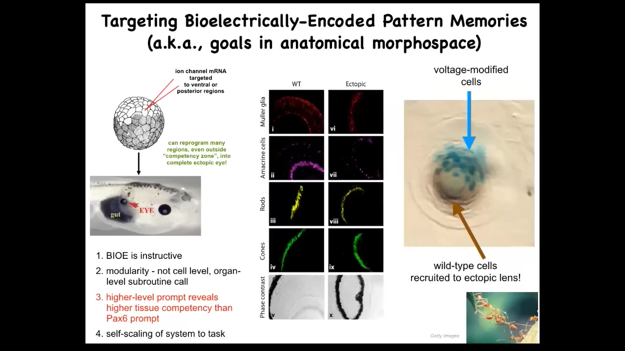 I've shown you that by manipulating the bioelectric states, you can change the size of that goal-directedness, the size of the cognitive light cone. I've shown you that you can induce specific pattern memories. For example, eyes. We can do some other organs.