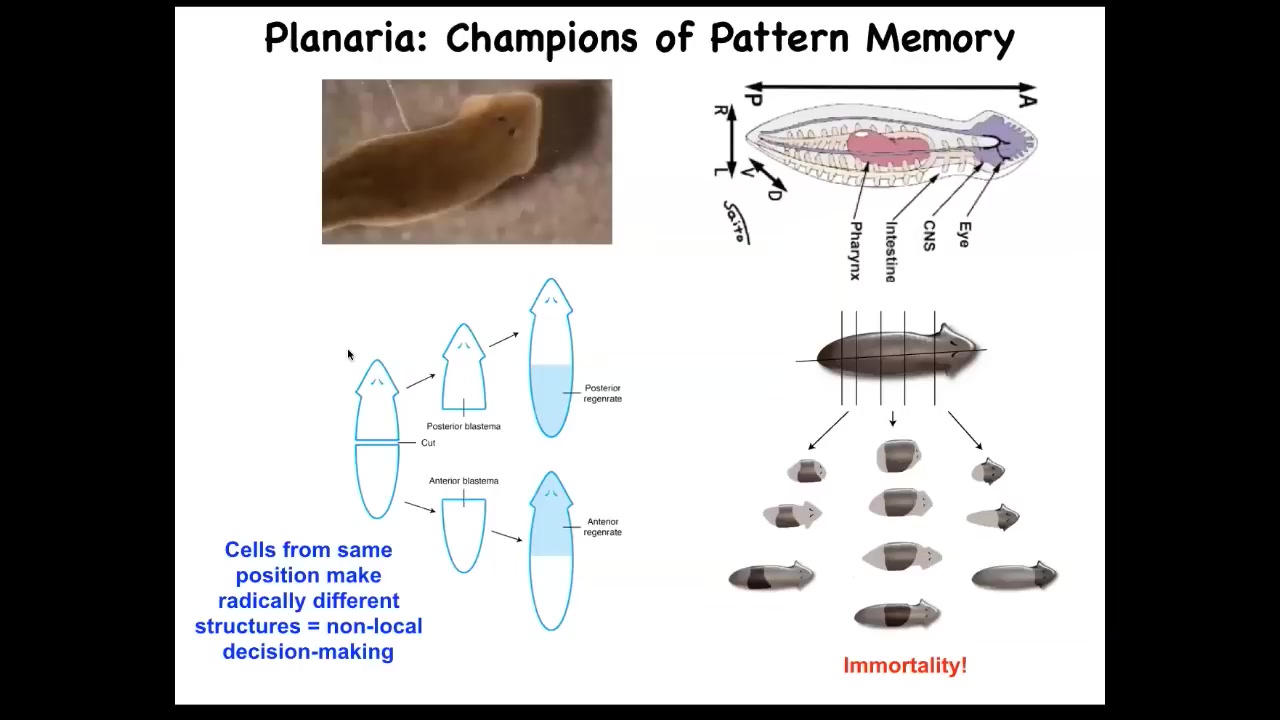 And now I want to show you more specifically what these pattern memories look like. This is our planarian, and I remind you that you can cut them into many pieces. The record is something like 275, I believe. And they're also immortal, so they go on forever. They just continuously regenerate.