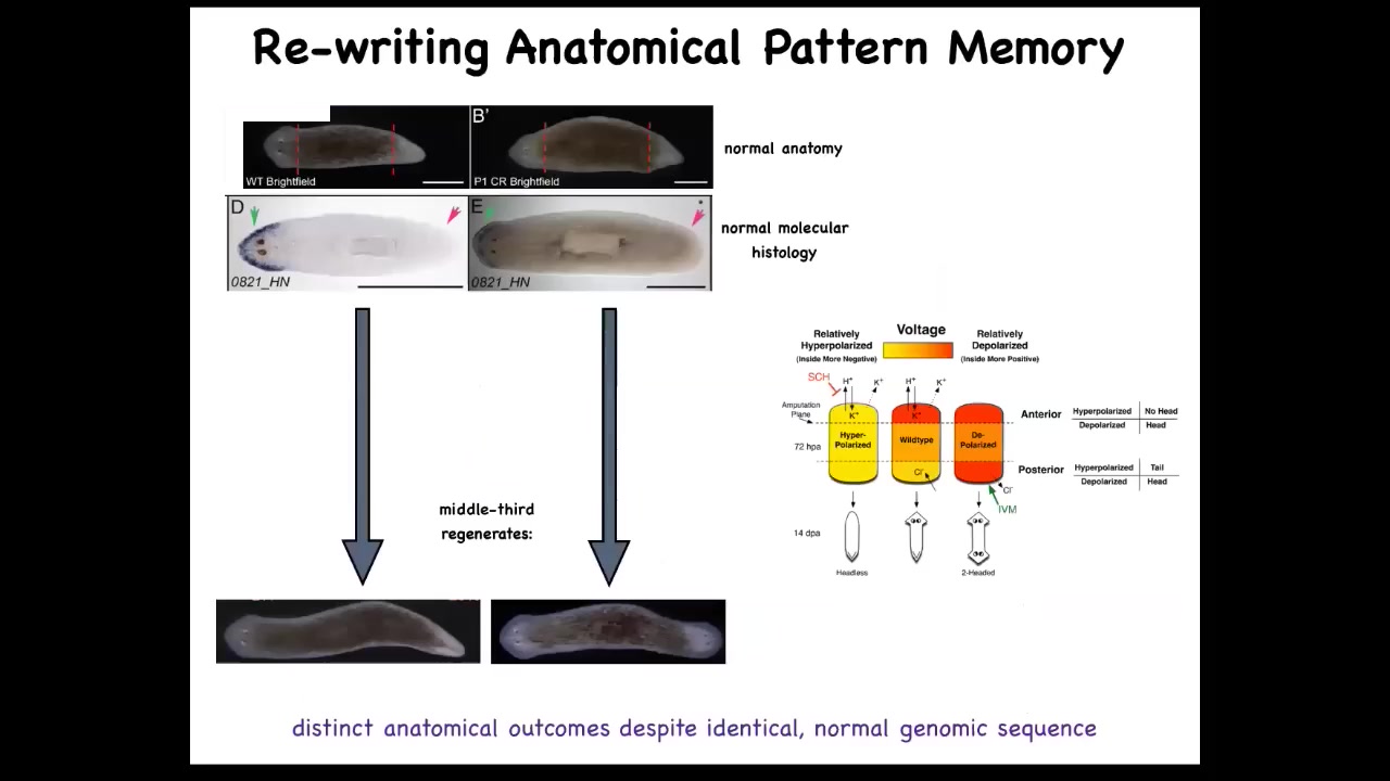 Now, I keep calling it a pattern memory because if I cut these two-headed worms into pieces again and again in plain water, they continue to generate two-headed animals. You might think that if I amputate this ectopic secondary head and the genetics are normal, we haven't touched the genome, then that hardware should just go back and continue to make normal worms. But that's not what happens. The memory holds and it keeps the two-headed state. And then we now know how to turn it back. This has all the basic properties of memory. It's long-term stable, it's rewritable, it has conditional recall, and it has discrete behaviors, discrete paths that it takes in anatomical morphospace. Here you can see these two-headed worms hanging out. The question of how many heads a planarian is supposed to have is not directly written in the genome. The genome encodes some hardware that, when the juice is turned on, by default, makes a pattern that says one head, but it's reprogrammable. This tissue is reprogrammable such that when we change that pattern, it holds.