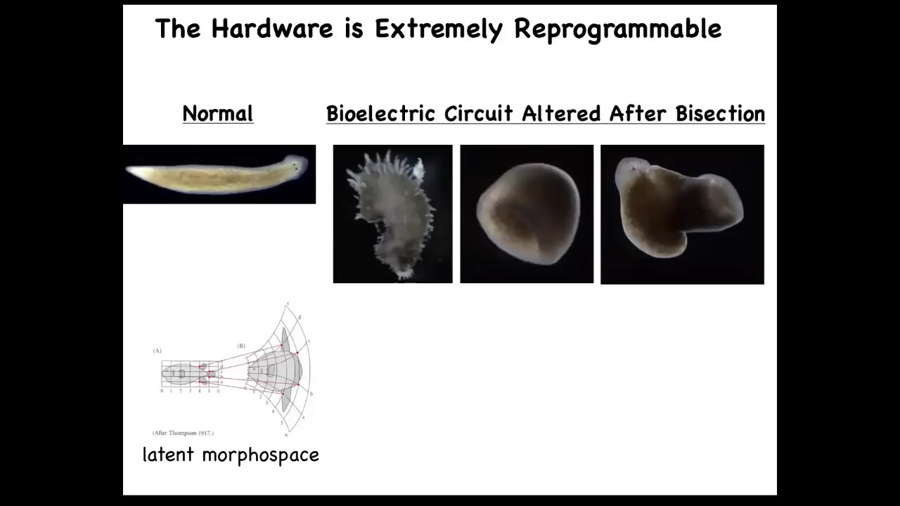 In fact, you can get them to make shapes, crazy shapes that don't look like a planarian at all. That's because there's a huge latent morphospace around the normal physiological behavior of that system. You can push it to explore other areas of that morphospace.
