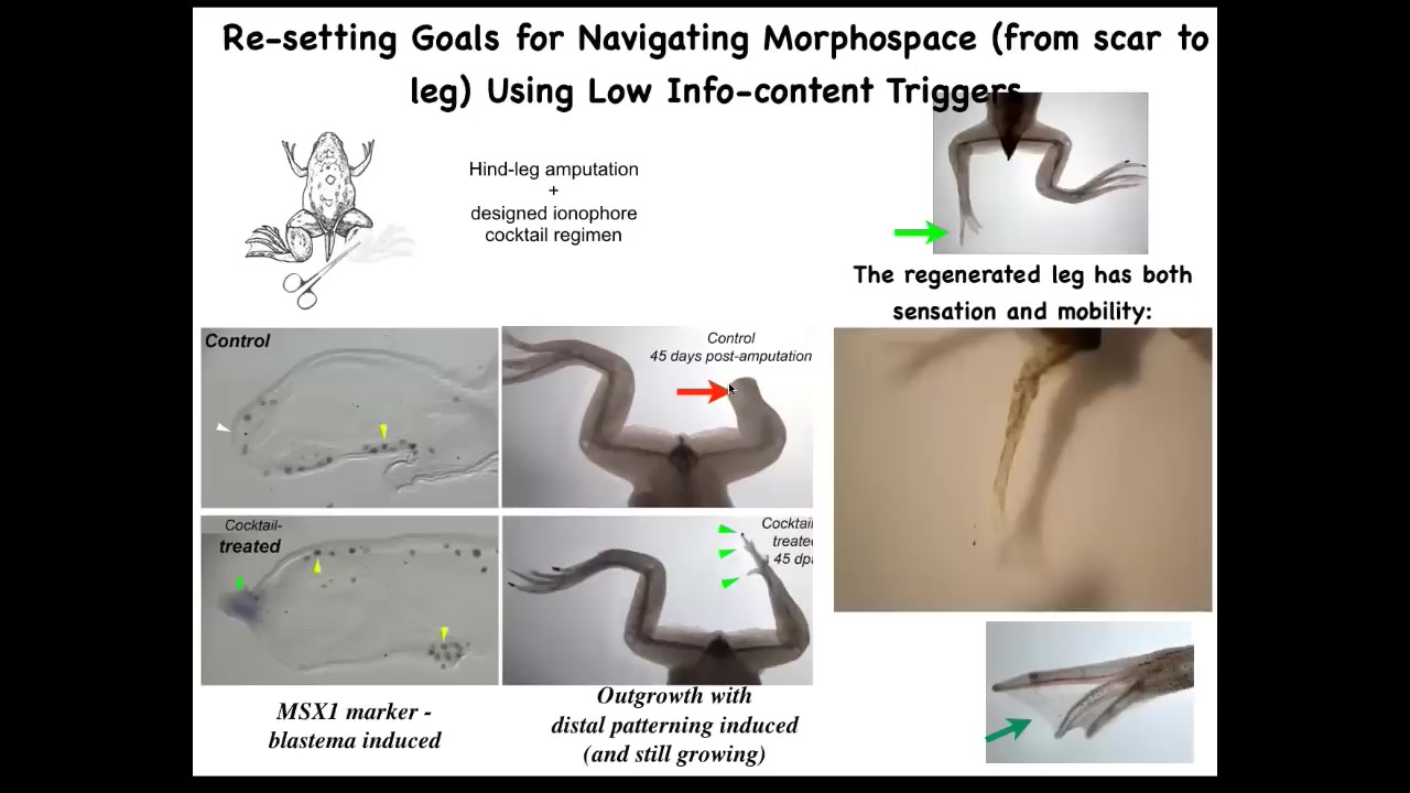 Frogs, unlike salamanders, do not regenerate their legs. Normally after 45 days, you get nothing, but we made a bioelectric cocktail that triggers leg regeneration within 45 days; you already have some toes, you've got a toenail, eventually a pretty respectable leg that's touch sensitive and motile.