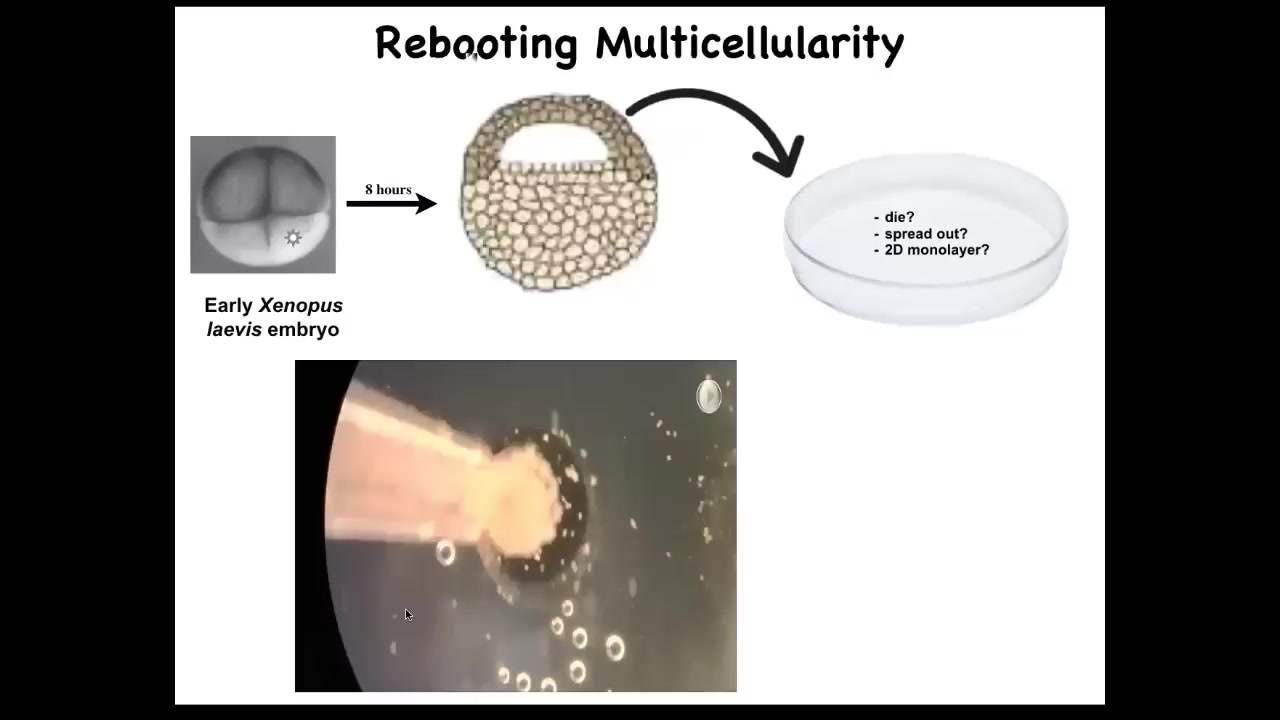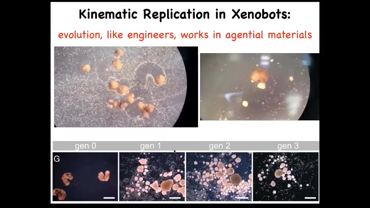 Here's a 2 1/2-month-old xenobot. It's turning into something. I have no idea what it's turning into. The idea here is this. What we've done is we haven't changed the genome. We haven't put in any weird nanomaterials. All we've done is liberate these skin cells from their normal environment. We found out that their normal, boring, two-dimensional life as the skin of the outer surface of the animal is basically forced upon them by the instructive interactions of their neighbors. If you take them away from that, you get to see the native form of what these cells really want to do. This is what they do when nobody's telling them what else to do. This is a reboot of their own goal states. They do this, which nobody had any idea was possible. You can't use evolutionary selection to explain this because there's never been any xenobots. There's never been selection to be a good xenobot. This is something that we made for the first time here. Of course, the cells were in the evolutionary stream, but they lived this life. They never lived this life before. Where did this kinematic self-replication come from? It's a really deep question.