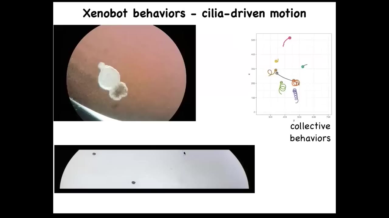 This little ball starts to swim. We call these Xenobots because Xenopus laevis is the name of the frog, and we call them biobots. We think it's a bio-robotics platform. They have little hairs on their surface that they wave, and they row against the water. The hairs are normally used to move mucus down the side of the frog, but these guys have used it for swimming. They can go in circles. They can patrol back and forth. They have all kinds of group behaviors. These guys are interacting with each other. These ones are taking a rest. This was one who was going on a long journey.