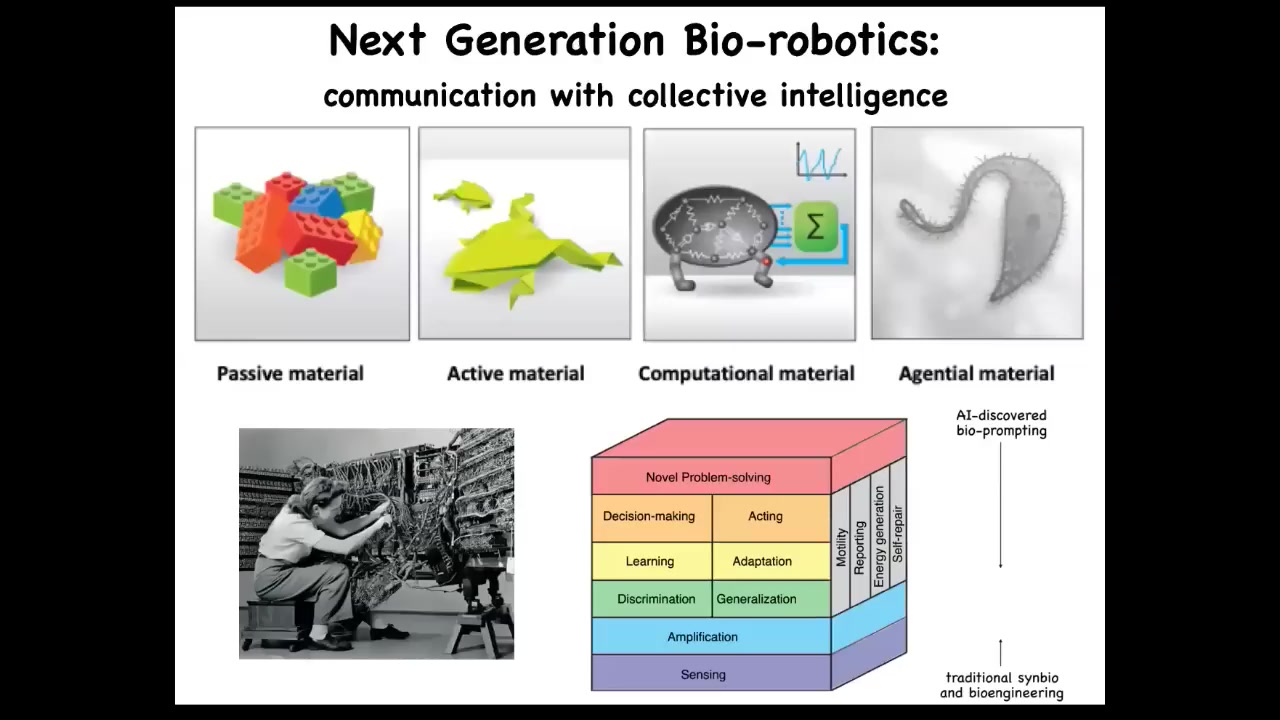 As we're doing robotics, engineering for millennia has been using passive materials like wood and metal, but we're moving to active matter and even computational matter. The future is here. It's in a gentle matter. It's in materials that you don't control bottom-up the way you do with this kind of hardware. You take advantage of all these things they already know how to do. We're working on some techniques for bio-prompting, which is to learn to program this kind of material, not by trying to force states, as in synthetic biology, but by training them and giving them various stimuli that reset their set points.
