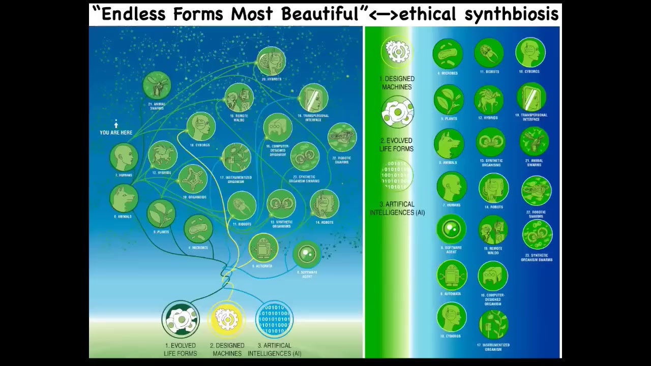 You and this audience will be living in a world with many other creatures who are nowhere on the tree of life relative to you. That is, their origin story and their composition are no longer good guides, and their place in the evolutionary web is no longer a good guide to how to relate to them. They're going to be truly alien bodies and minds with different degrees of recognition. That means we need to develop some new ethics around a kind of synth biosis where you can coexist and flourish by interacting with beings that are very different from us and the old ways we used to figure out how we relate to plants and animals and ecosystems and each other in terms of, what are you made of and what do you look like? Did you come out of a factory or were you evolved and do you look like me and do you have the same kind of brain?