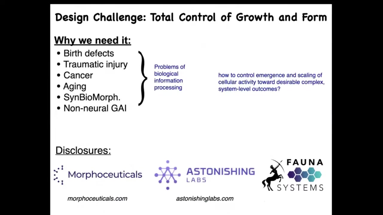 Not only biomedical problems, but synthetic biomorphology — not just reprogramming individual cells, but programming a large-scale shape and structure. Non-neuromorphic AI would become possible. All of these things boil down to one problem. How do we communicate our morphological goals to a group of cells? I have to do disclosures because I'm involved in three different spin-offs from my lab, which I'm happy to talk about afterwards: more for suitables, astonishing labs and fauna systems.