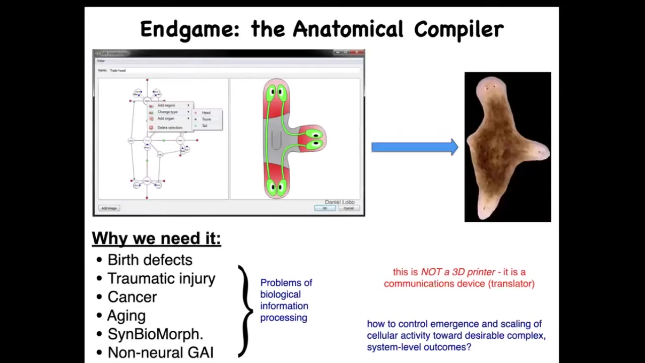 The solution to these problems we call the anatomical compiler. The idea is that at some point in the future, you will be able to sit down in front of a computer and draw the animal or plant that you would like to have. You would draw the three-dimensional structure, the anatomy, not the molecular biology of it, but actually the anatomy of what you want. This system would compile that anatomical description into a set of stimuli that would have to be given to cells to get them to build whatever you want. And in this case, here's this three-headed flatworm. I'll show you some flatworms in a minute.