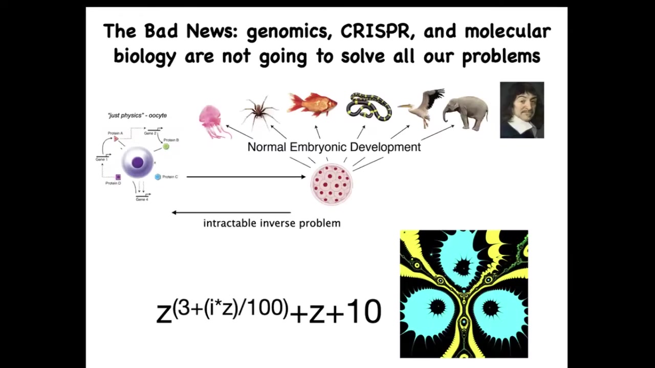 Now the bad news is that by themselves, these very important technologies, such as genomic editing and molecular biology, are not going to give us everything that we want. Because this process of going from a single cell egg to one of these complex bodies — this morphogenetic process — is incredibly complex and recurrent. In other words, all of these cells are doing various things and together they end up building something like this. But reversing this is extremely hard.