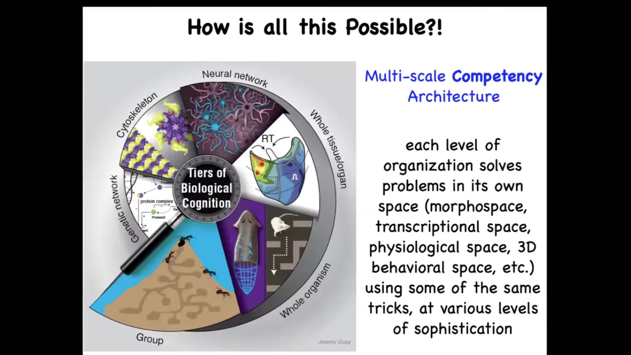 And it's possible because biology, unlike most of our technology, I sometimes give a different talk called "Why Robots Don't Get Cancer." The reason that biology is so special, and there's no reason why we couldn't emulate this, is that it uses a multi-scale competency architecture. The idea is that at every level, from molecular networks to cells, to tissues, to whole bodies, whether in behavioral space or anatomical space, or even collectives, each of these layers solves its own problems. They are not just structural. They are problem-solving systems that operate or navigate in the space of gene expression, the space of physiology, the space of anatomy, and of course, the three-dimensional behavioral space, in our case also linguistic spaces. And they all have different levels of sophistication and different competencies to do this. But the key is that rewiring them physically is not the only game in town. We also have the opportunity, because their intelligence is higher than a simple hardwired clockwork, to communicate with them, to reset their set points, and to have various other kinds of interesting interactions with them.