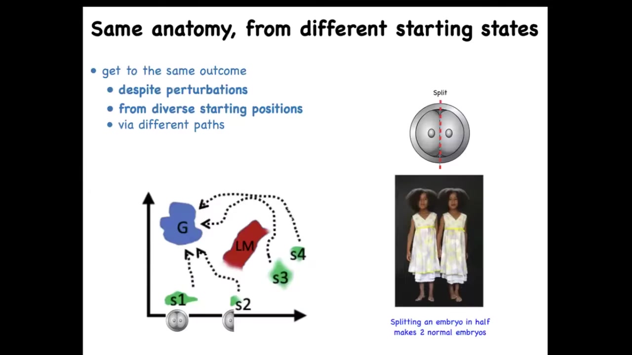 This multi-scale architecture of competency, meaning that we are made of cells that used to be independent organisms and didn't drop all their intelligence when they joined together, means that we have lots of different competencies in morphogenetic space. For example, when you take an early embryo, a human embryo, and you cut it into halves or quarters, you don't get 2 half bodies, you get 2 perfectly normal monozygotic twins because each half can recognize that the other half is missing and rebuild what it needs. In fact, you can think of embryonic development as a kind of regeneration of the entire body from just one cell. There's this ability of different systems, here's the normal embryo, here's the embryo cut in half and so on: the ability of different systems to navigate this space to reach the ensemble of goal states that we associate with normal target morphology or normal anatomy for that species, and in fact, in many cases, going around avoiding various local maxima that would trap a less intelligent system. This is one example of regulative development.