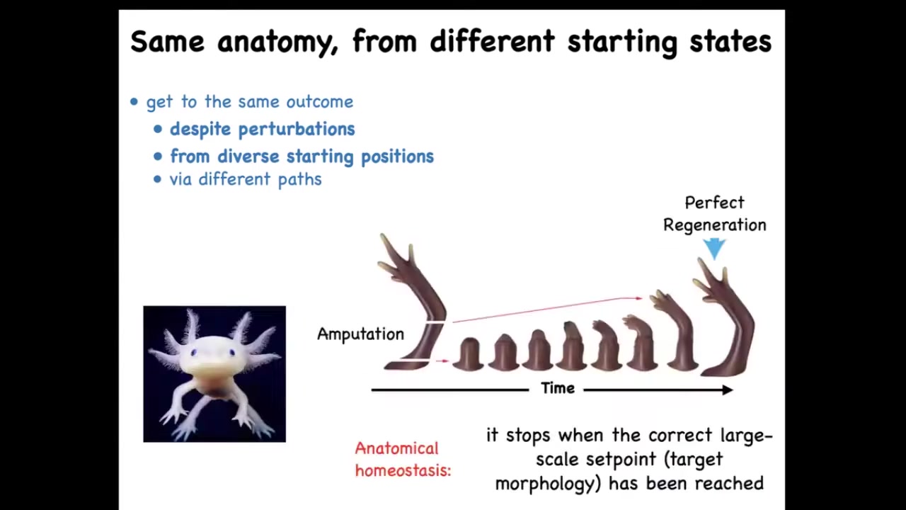 Here's another example. A creature like this is an axolotl. And these guys regenerate their legs, their eyes, their jaws, their portions of their heart and brain, their ovaries, spinal cord, and so on. If you amputate, and they bite each other's legs off all the time, so this is a natural experiment that keeps happening, you can amputate anywhere along this line, and the cells will very rapidly build exactly what's needed. And then they stop. Now this is the most amazing part of this whole process. Not only does it regenerate no matter where you cut it from, it makes exactly what's needed, no more, no less, but it ever stops. How does it know when to stop? It stops when a correct salamander arm has been completed. So this tells you that this is some sort of navigation policy in this anatomical space. It's an error minimization scheme where errors like this become corrected over time and when the error is small enough, they stop.