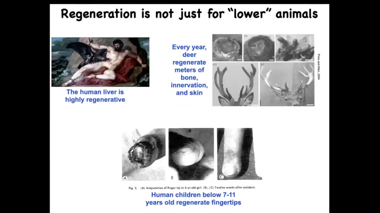 Deer are large adult mammals that regrow meters of new bone, vasculature, and innervation. They do it every year at a rate of about a centimeter and a half of new bone per day. It is not the case that mammals are somehow unable to regenerate, but our capacities at present, and I do think this is changeable, are not as good as those of certain other organisms.