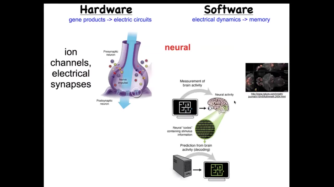 Here it is: this group imaged all the electrical activity of a living zebrafish brain as zebrafish are thinking about whatever it is that zebrafish should normally think about. You can see all this activity. It's the commitment of neuroscience that all of the cognitive activity, the goals, the preferences, the memories, the behavioral repertoires of this animal are in this physiological activity, if only we could decode it. There's this notion of neural decoding where you can scan a brain, decode it somehow, and figure out what the animal is thinking about or looking at. There's been success in this both in humans and in model systems. The amazing thing is that brains and neurons didn't invent it from scratch. This is something that living systems have been doing since the time of bacterial biofilms. That far back, evolution discovered that electrical networks are amazing at storing and processing information. Every cell in your body has these ion channels, and figuring out what is a neuron and what isn't is not trivial at all. Most cells are connected to their neighbors with these electrical synapses. You can look at early embryos or regenerating limbs or anything else using the same techniques, electrical imaging, and try to do the same decoding program. You could ask, could we learn to decode what the cells are saying to each other, and then rewrite those patterns and get them to build something else?
