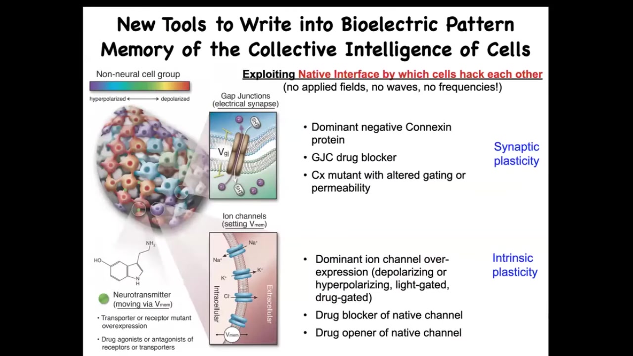 That's how we read these patterns, and we've developed tools to rewrite these patterns. We don't use electrodes, applied fields, waves, or frequencies. What we do is exploit the native interface by which the cells are normally hacking each other's behavior, which are the ion channels on their surface and the gap junctions that allow them to talk to each other. We have ways, mostly appropriated from neuroscience, using optogenetics and drugs to open and close these channels and to control the topology of the network.