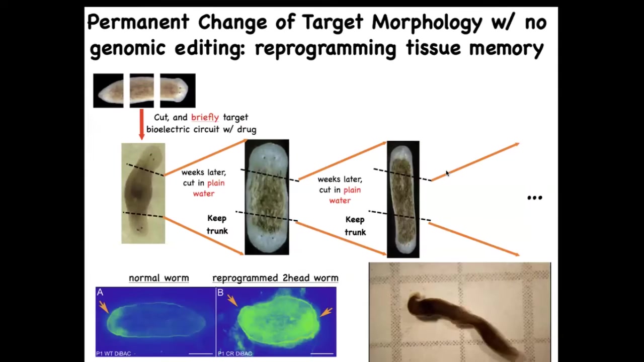 The amazing thing is that once you've got this two-headed worm, that's it. From then on, if you amputate the primary head, you amputate this ectopic secondary head; this middle fragment will continue to regrow 2 heads. The genetics are untouched. We never did any genomic editing here. There's no transgenes, no new circuits, no synthetic biology, nothing. All we did was a very brief physiological stimulus that rewrites a pattern memory. This is the way that people read the memories of a brain by looking at the electrical activity. We can now read the memories of the collective intelligence of the body.