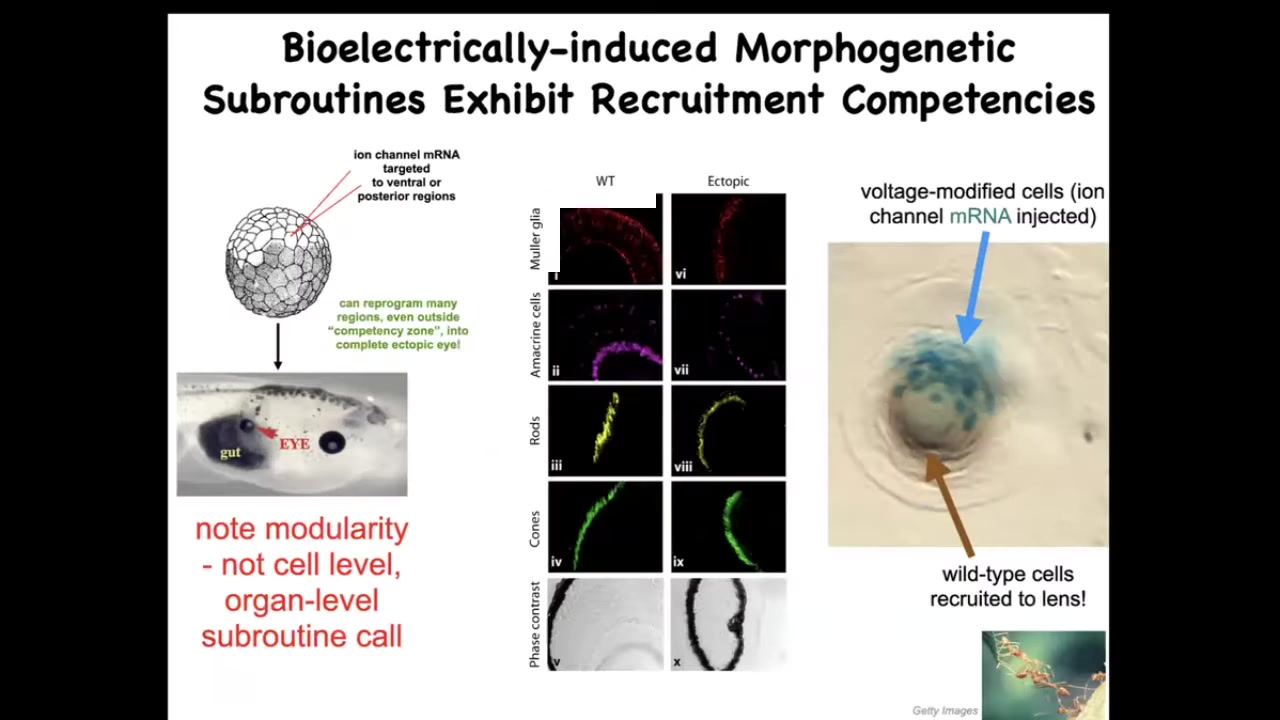 This has to do with organ-level induction. We can inject certain ion channel RNAs that will induce, for example, we can copy that eye spot that I showed you in the electric face. We can put it anywhere in the body. If we put it on the gut, these gut cells happily make an eye, and this eye has all the right lens and retina and optic nerve and all of that. But notice a couple of interesting things. One is that we didn't have to put in all the information about how to make an eye. In fact, we don't have any idea of how to make an eye. What we do know is that there's a high-level subroutine call that says to the local cells, make an eye. And then all the stuff downstream, all the morphogenesis, all the gene expression, all the gradients, everything else is taken care of.