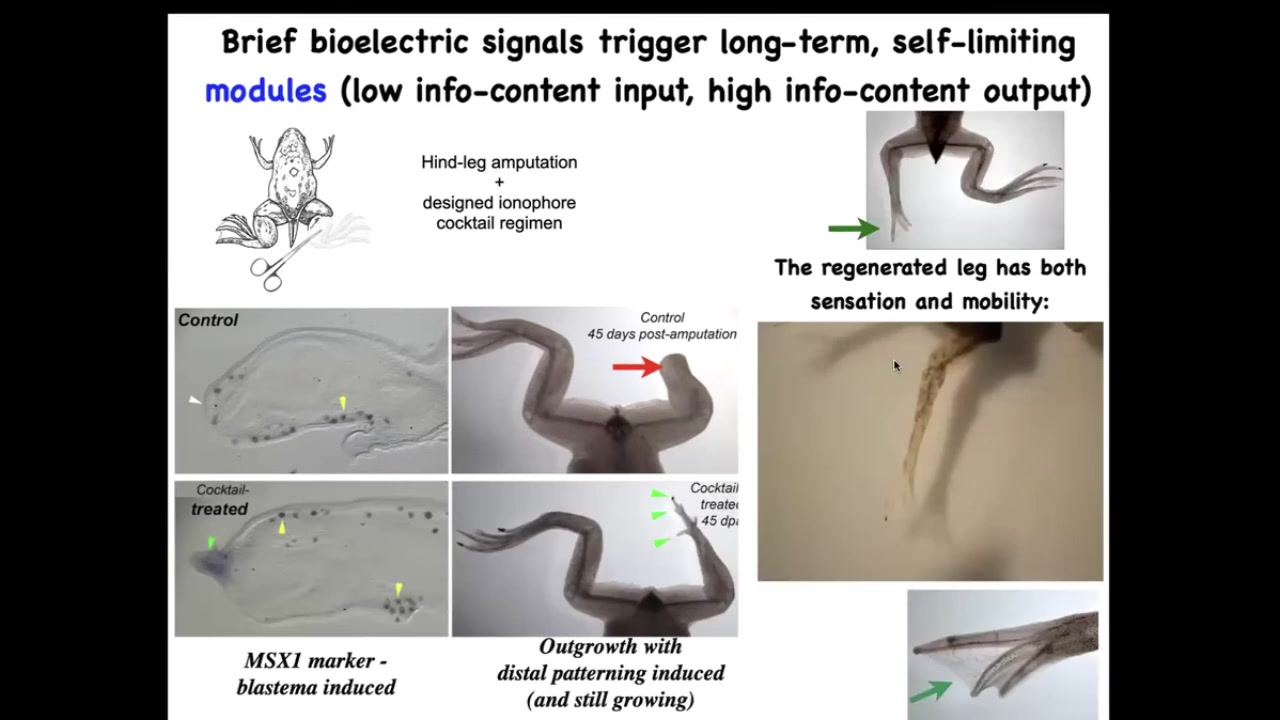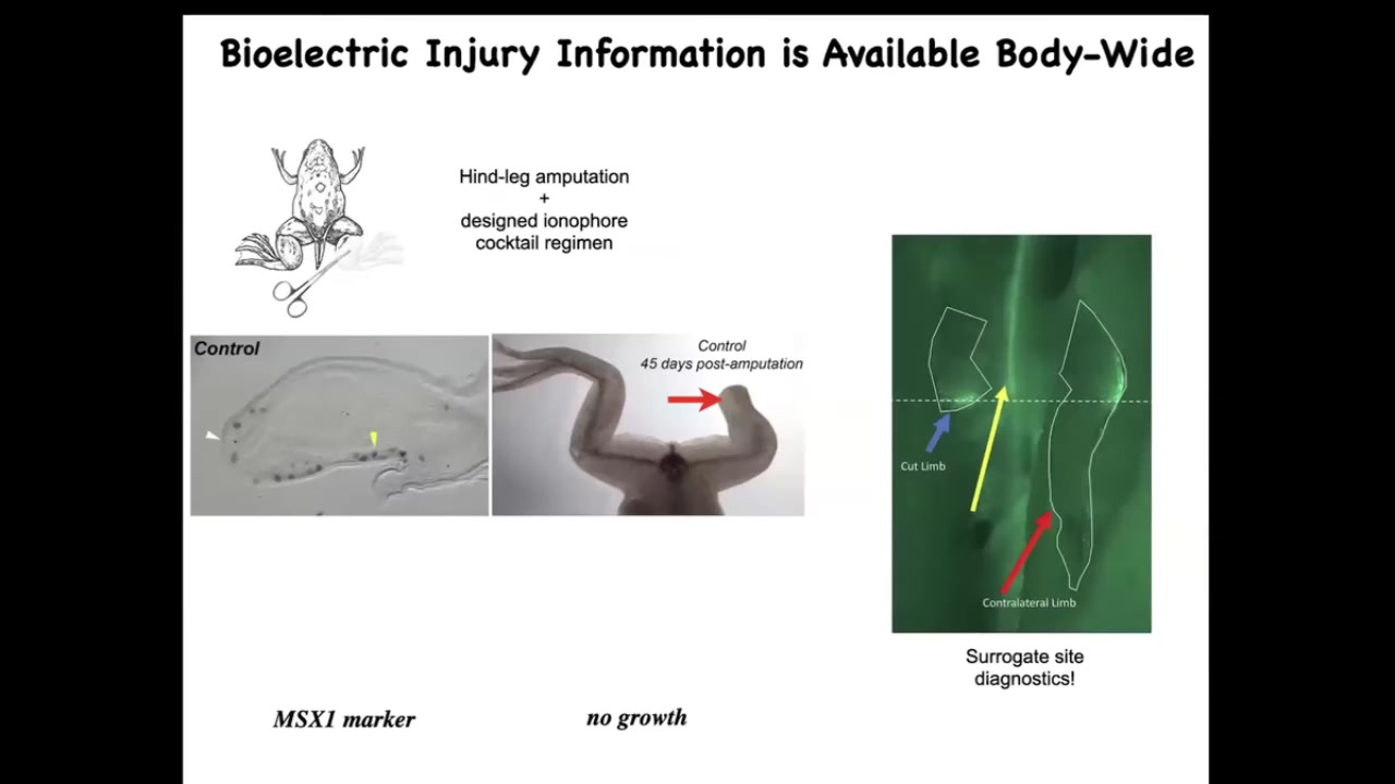 Moving to the regenerative part. In a frog, unlike a salamander, if it loses a leg 45 days later, there's nothing. Once you do the amputation, the opposite leg lights up bioelectrically within 30 seconds at exactly the location where the damage took place. The whole body knows about this, and this can serve as surrogate-site diagnostics. Already you can read out where the damage was.