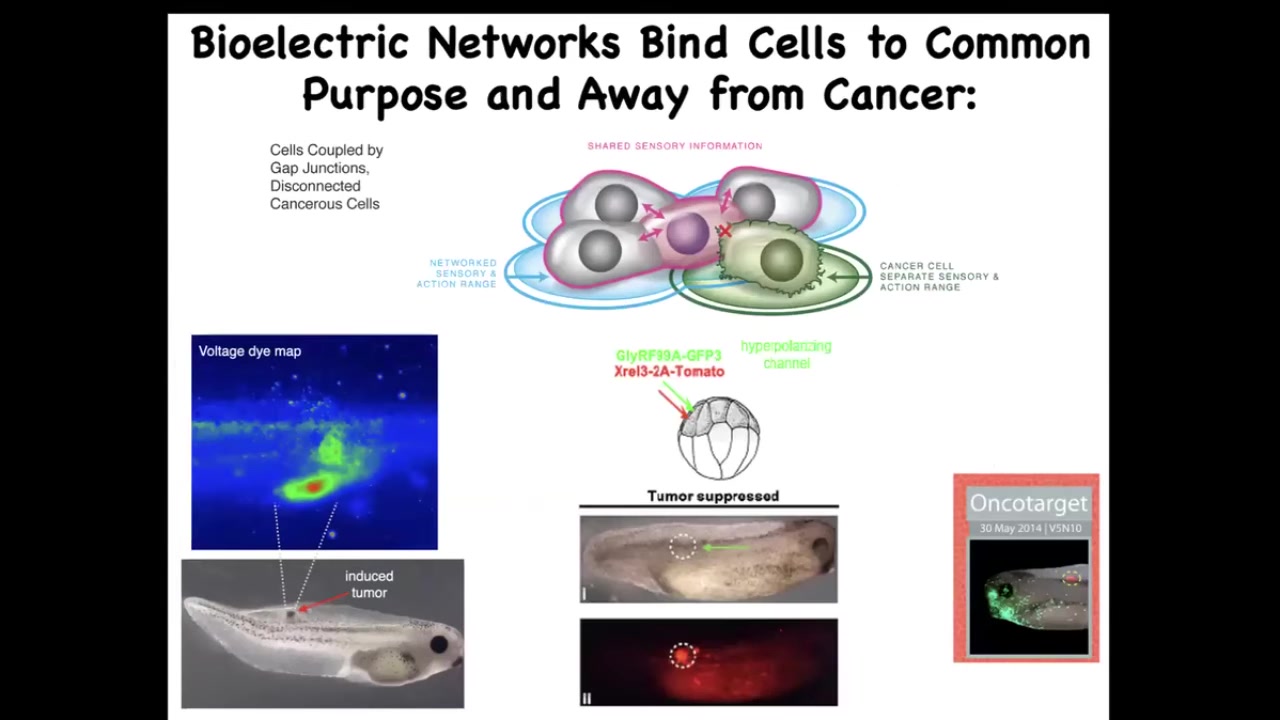 There are also applications to cancer. I showed you this picture a minute ago. Once you start thinking about this as these electrical networks as a way of creating a larger-scale system that can pursue large goals building nice organs instead of little tiny amoeba-level goals of proliferate and migrate. Then what we can do is we can artificially reconnect these cells. When the oncogene tells them to disconnect, we can force them to be in the right electrical state. You see here, the oncogene is labeled in red. This is the same animal. There's tons of it. If you were to sequence this, you would see that there's a nasty KRAS mutation. You would say, there has to be a tumor there. In fact, there is no tumor, because what we've also done is co-inject an ion channel that forces these cells into electrical communication with their neighbors and does not let them detach. There's a cancer therapeutics thing here.