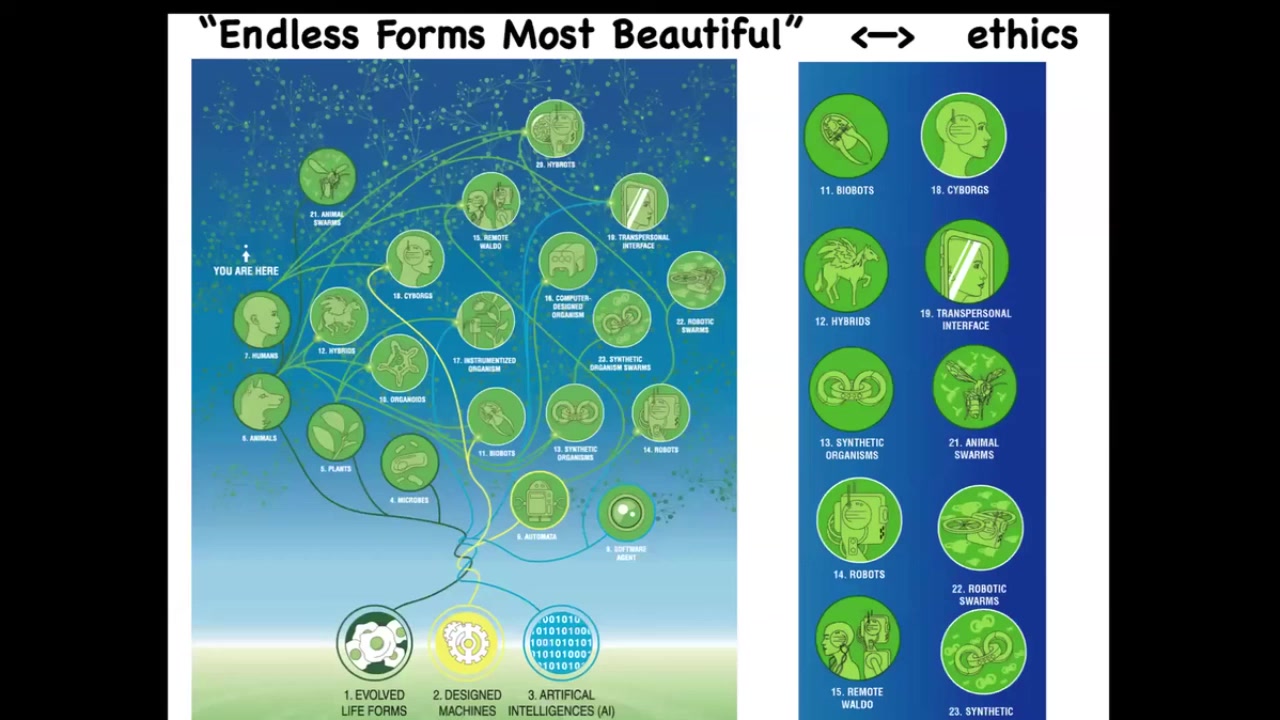 In the future, almost any combination of evolved natural material, designed material, and software at whatever scale is some viable feature. I think in the future, we are going to be surrounded by all kinds of hybrids, cyborgs, and all kinds of things, which are going to require a new kind of ethics for relating to beings that are nowhere on the normal tree of life with us. In other words, we cannot use familiar criteria of where did you come from, meaning evolved or designed, and what are you made of, meaning do you have a brain, does it look human. Those criteria are going to be out the window. Everything that Darwin meant when he said "endless forms, most beautiful" is a tiny corner in this enormous option space of possible bodies and possible minds.