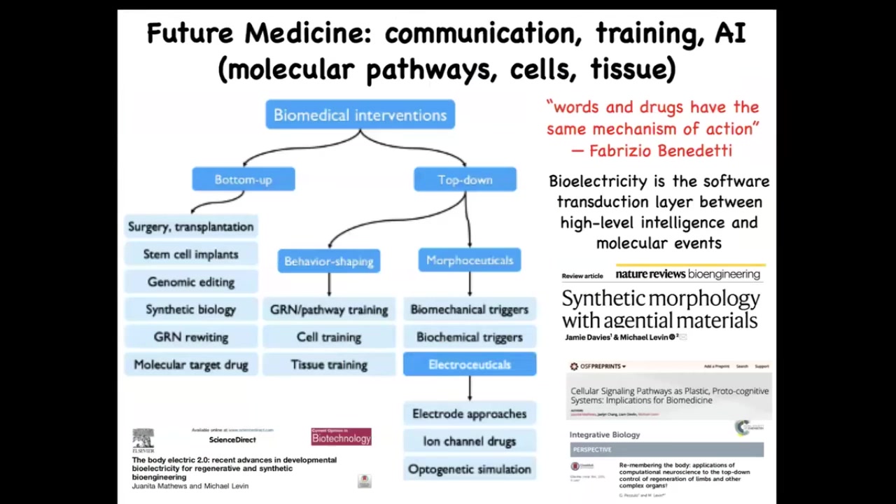 You do that every time you get up out of bed. Your intention of getting up feeds down into the molecular properties of your muscle cell membranes that make you get up. The idea, especially using bioelectricity as this transduction layer, that software layer between the intelligence and the actual execution machinery and AI to manage this gives us a whole range of strategies that are in complement to all the successful mainstream strategies.