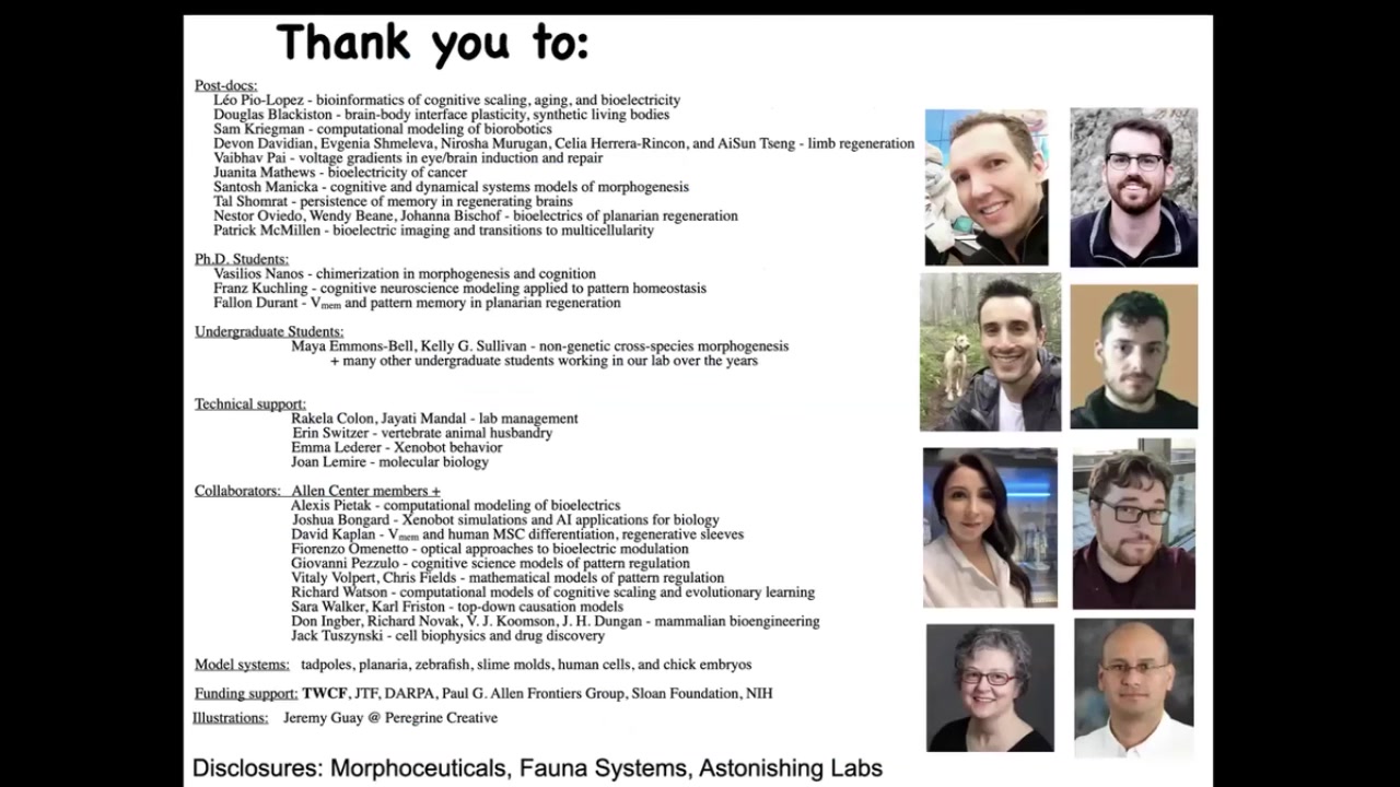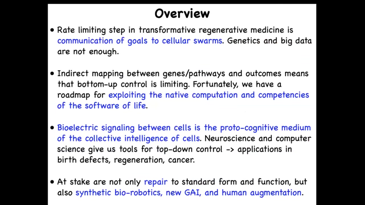To summarize what I've said, the rate-limiting step in truly transformative technologies is the communication of goals to cellular swarms, not the molecular details, but the algorithms of life. We have a roadmap for exploiting the native computation and the competencies of living networks. Bioelectrical signaling is a crucial proto-cognitive medium of that collective intelligence. We now have tools that appropriate all kinds of deep concepts from neuroscience to help us understand this in other contexts. At stake are a huge number of transformative applications.