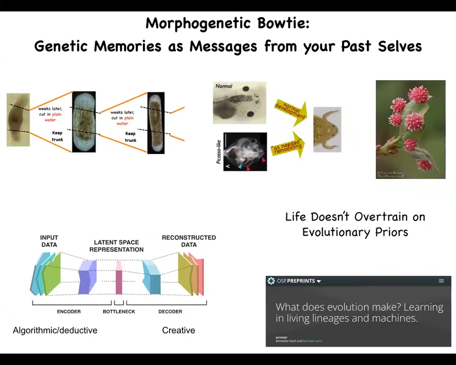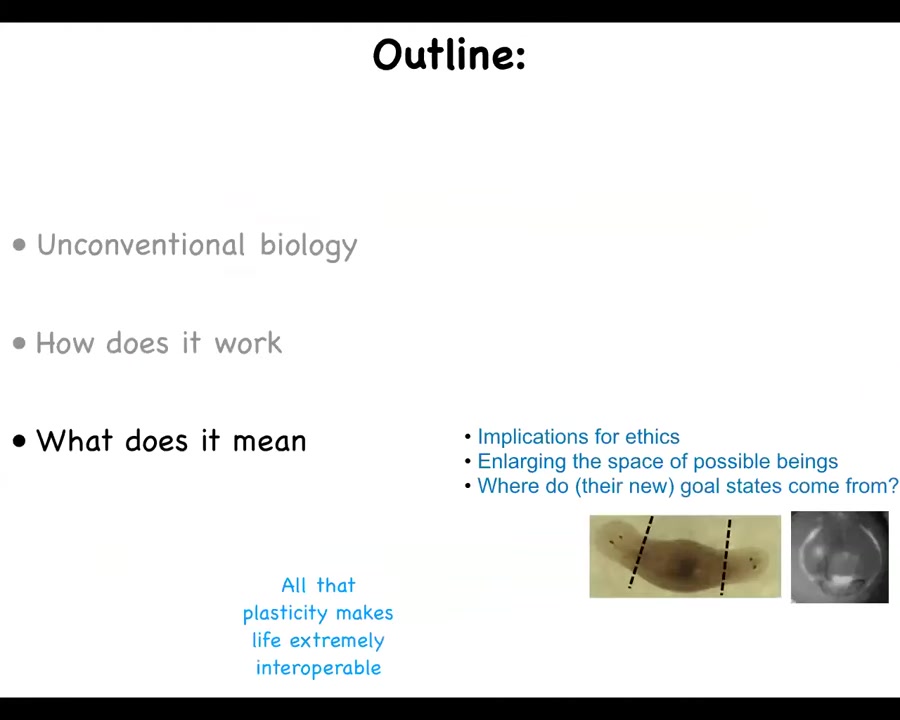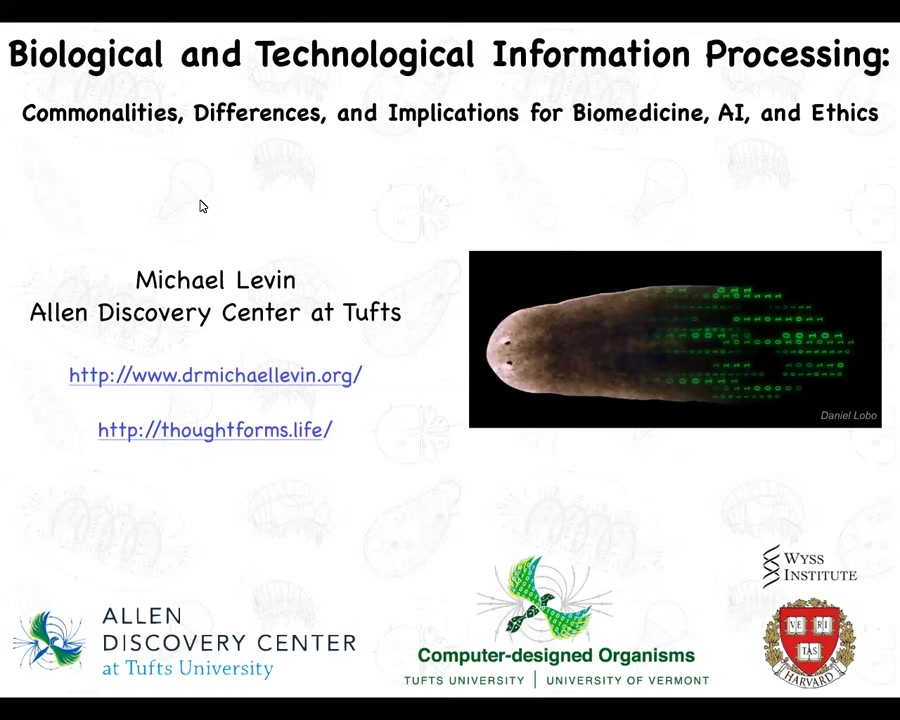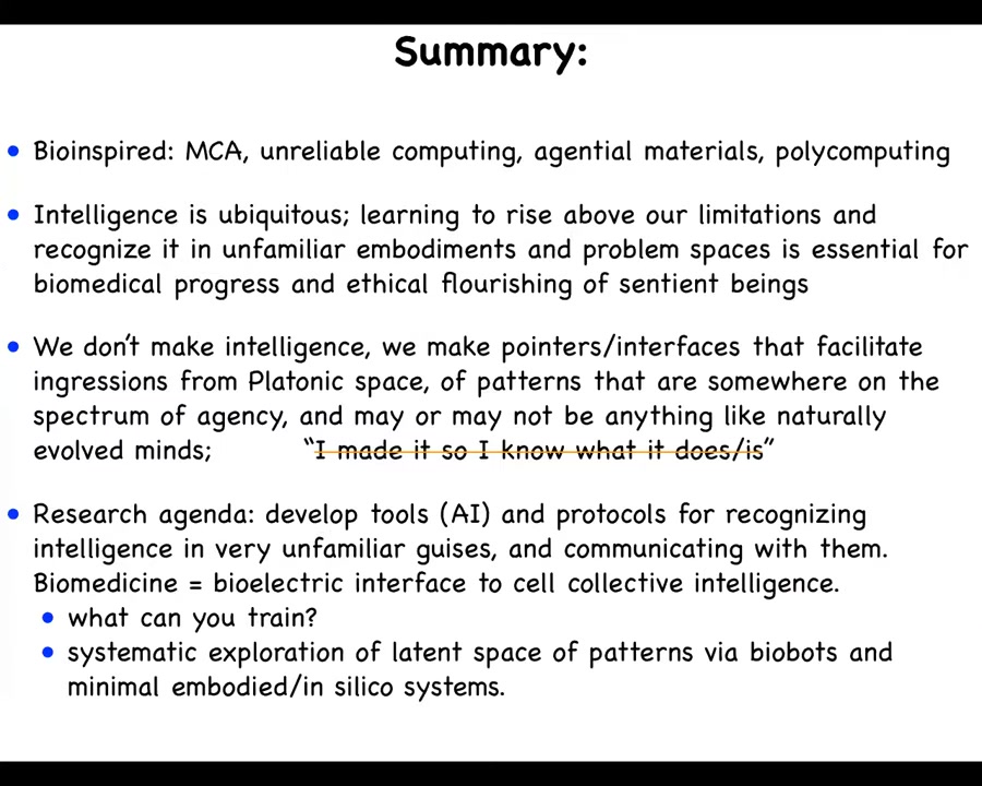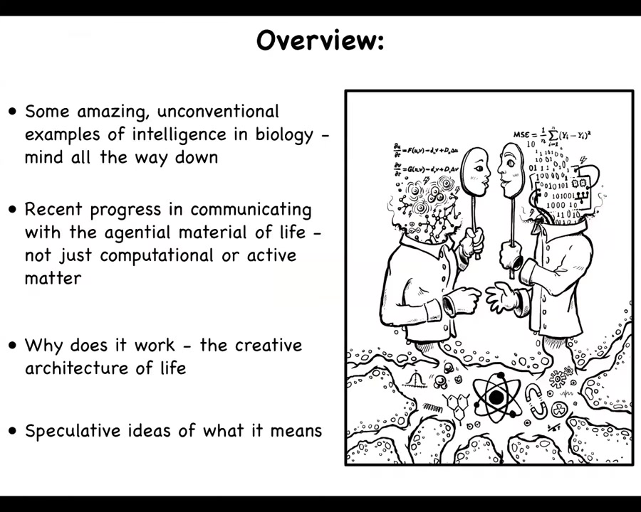 I'm going to talk about the recent progress we've made on communicating with the agential material of life, in particular, the bioelectric interface that has many applications in medicine and engineering. I'm going to talk about why I think it works. What are the principles that are special for the agential material of life? At the end, I will speculate wildly on what I think it means for not only biology and medicine, but AI and beyond.