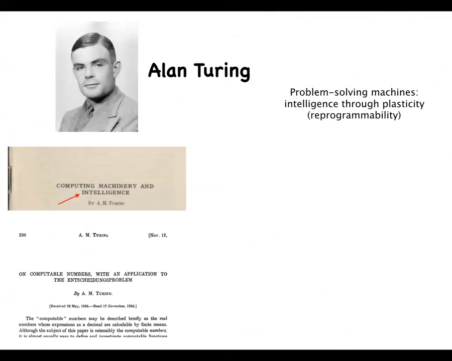 So Alan Turing needs no introduction. He was very interested in intelligence, broadly conceived in different embodiments, and in particular in problem-solving machines, that is, intelligence through plasticity or reprogrammability.