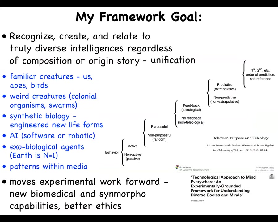 This means the familiar creatures such as primates and birds and maybe an octopus, but also very unusual creatures like colonial organisms and swarms, synthetically engineered new life forms that have never been on Earth before, AIs, whether purely software or robotically embodied, potentially someday exobiological agents, aliens. Even something that's even more unusual, which I won't have time to talk about today, but actually patterns with the media that don't look like traditional embodied minds.