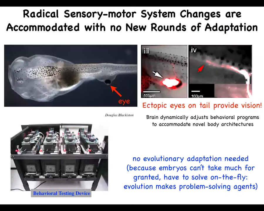 This is remarkable because the traditional story that we're told is that the sensory motor architecture of a creature has to be evolved and shaped over eons of mutation and selection and so on. Why does this work out-of-the-box? Why does this creature, which for millions of years evolved with eyes sitting next to the head up here connected to the optic tectum, suddenly work? It can see when there's this weird patch of tissue on its tail. You don't need any more evolutionary adaptation. I'm going to argue that's because what biology builds is problem-solving agents. That is, even the standard tadpole could not assume that it was going to be a standard tadpole. It makes problem-solving agents. That plasticity was one example.