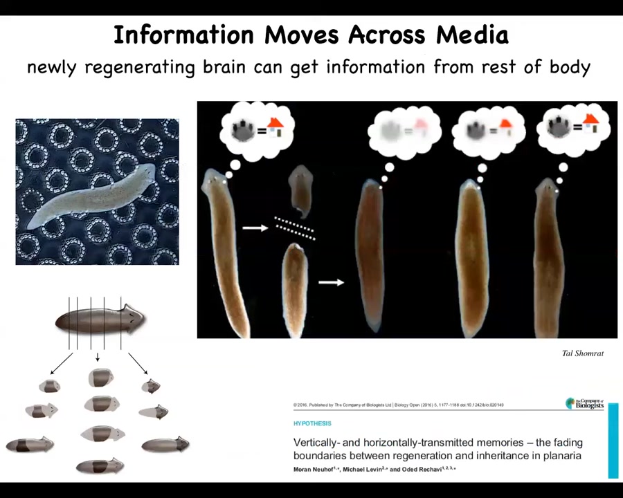 Here's another one. These are planaria. These are flatworms. They have a central nervous system. They have a brain. They have eyes. And what you can do is cut them into pieces. The record is, I think, 275 or something like that. And every piece will regrow a perfect worm. We'll see more about this later. But one of the things is that they're also smart, and you can train them to find food in this particular area that has these bumpy little discs laser etched into the surface. And this is called place conditioning. They associate this with a safe home environment. And you can then cut off their heads. The tail sits there for eight days doing nothing until it grows back a brain. At that point, behavior resumes. So the brain is controlled by the behavior. The behavior resumes, and then you find out that they remember the original information. This means that not only can it be stored elsewhere in the body, but it can also be imprinted onto the new brain as it develops. So the idea here is that you have information moving throughout living tissue, and also that the behavioral information and the structural information needed to build a brain go hand in hand where the new brain becomes the recipient and the memory colonizes this new real estate.