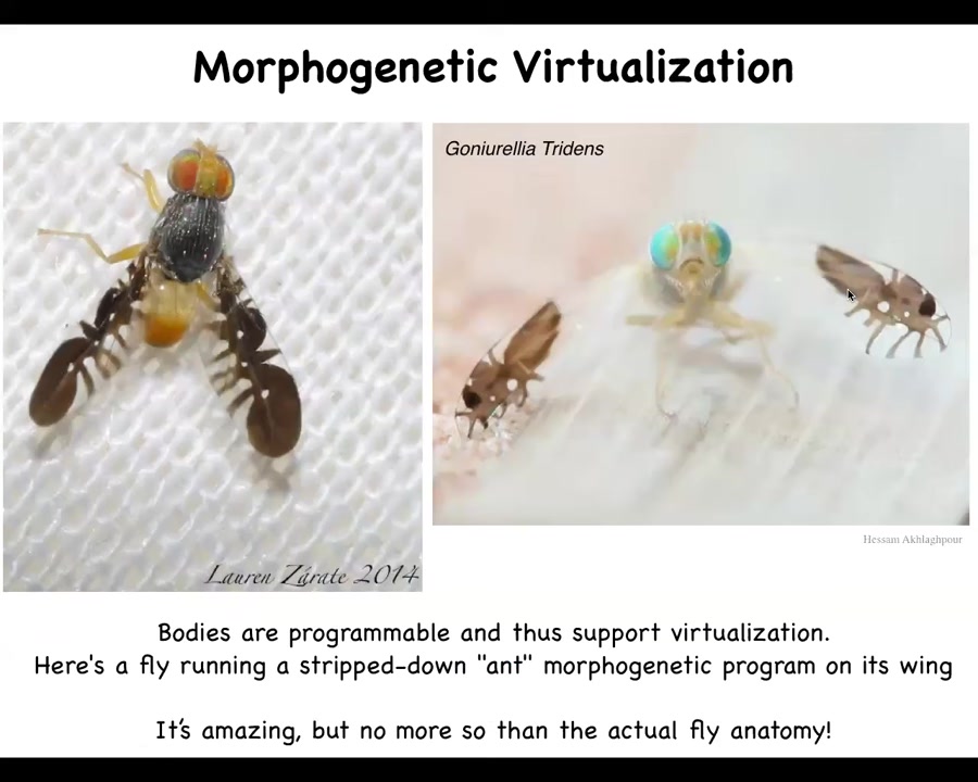 Here's a fly, and all of the weird images I'm going to show you today are real. None of this is Photoshop or AI. This is a fly that is running a stripped-down, two-dimensional, low-resolution virtual model of ants on its wings. And that's because it moves its wings around and simulates the scurrying of poisonous ants, and that keeps the predators away from the fly. So it's able to virtualize this kind of morphology, run it on the wings, which is remarkable, but not any more remarkable than the actual three-dimensional fly itself. And that just gives you an idea of the kind of plasticity that this system has. This ability to reliably reach this complex pattern is not hardwired.