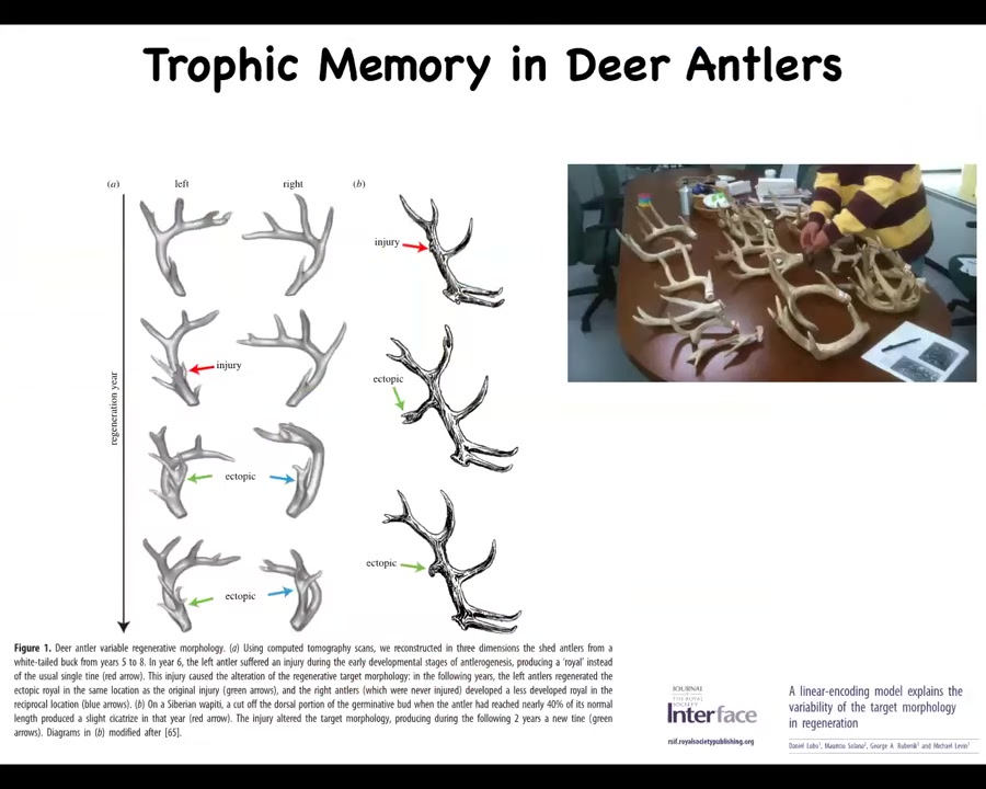 One is called trophic memory in deer antlers. These deer regrow this amazing structure with bone vasculature innervation. They drop it and then they regrow it. It was shown by a number of people that if you make an injury at one location on this tine, this whole thing will fall off. Next year, the antlers will grow a new tine at this location. The whole tissue is gone. Somehow for months, this information is stored somewhere in the body. Then that information becomes actionable when the cells have to make decisions about which way to grow. It reminds them to make this ectopic tine. Eventually, after a few years of this, it will go away. This is a kind of memory of injury. If you do molecular biology, what would a typical pathway model look like? People love gene regulatory networks and pathway models. What would it look like that could store the location of arbitrary damage somewhere along this branch structure, hold onto it for some months, and then use it to guide cell decisions later when the system is rebuilt?