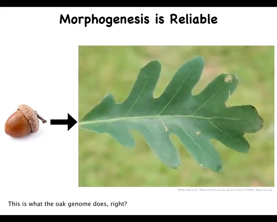 And the final thing is that this whole system is highly reprogrammable. You wouldn't know it because very reliably what happens is that this is an acorn, here's an oak leaf, and repeatedly all over the world this thing makes that thing. You would think that what the oak genome encodes is the instructions to make a nice flat green object that looks like this.