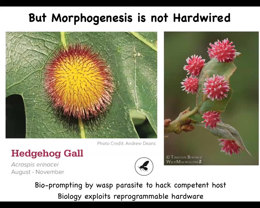 There's a bioengineer, it's a non-human bioengineer called a wasp of this type. There are many of these kinds. What it does is hack that system and lay down some signals that will induce the plant cells, not the wasp cells, to build this kind of structure. There are many amazing pictures of galls. What this is telling us is that while there's a default outcome that's reliably induced, the competencies are way beyond what we might be able to directly infer. If we understood how to communicate novel goals to these cells, we could take advantage and hack them for novel circumstances. Biology does this all the time.