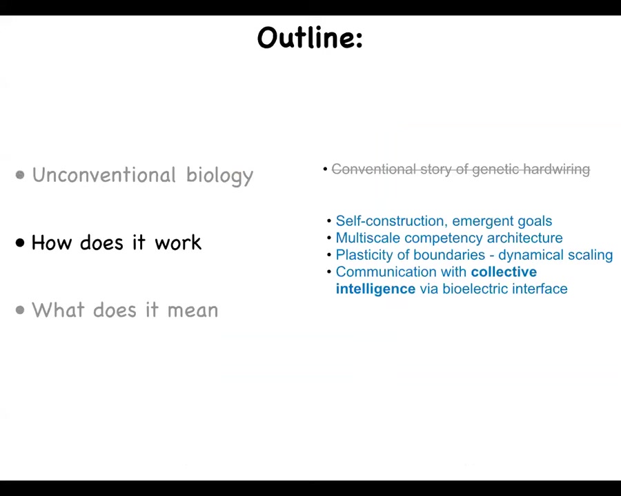 What this amazing plasticity, this robustness to change, the ability to come up with novel solutions under novel circumstances, how does all this work? We're going to talk about some of these features, such as self-construction, the multi-scale competency architecture, and the idea of communicating with the collective intelligence of cells.