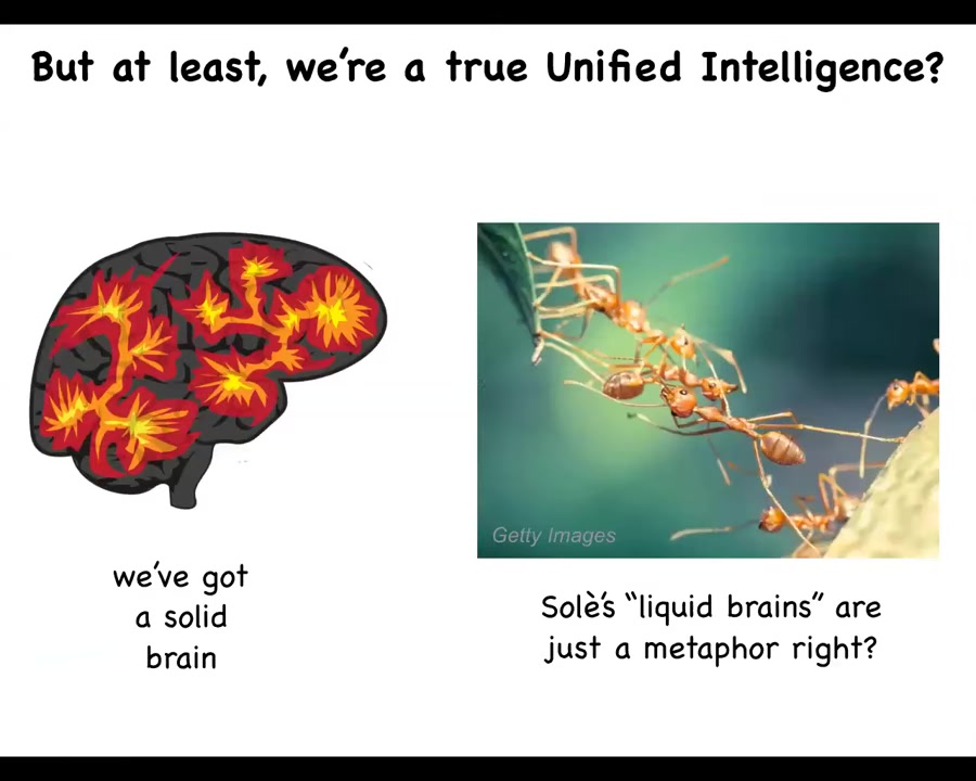 But at least we're a unified intelligence. Most people think that ant colonies and beehives are metaphorically called an intelligence or a super organism, but we are a true collective intelligence. In fact, because we have this nice solid brain.