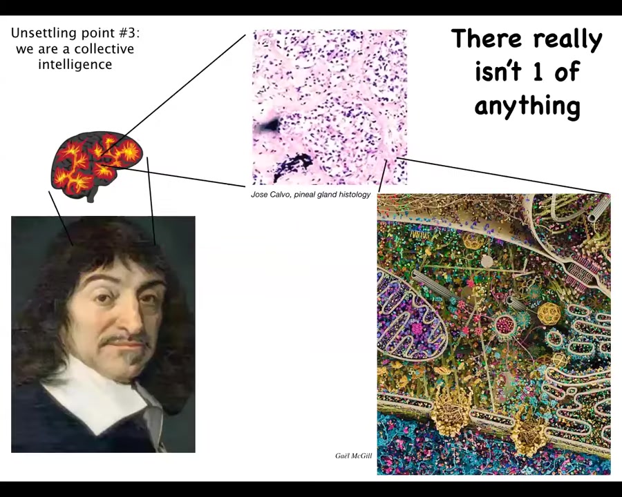 Descartes really liked the pineal gland because there's only one in the brain. Now, the problem is that he didn't have access to proper microscopy. If he did, he would have looked inside this pineal gland, and he would have realized that there really isn't one of anything. Inside the pineal gland is all of this stuff, all these cells, and inside each one of those is all of this stuff. Biology is extremely rich at every level. There isn't one of anything anywhere. We are all collective intelligences going all the way down to the molecular level.