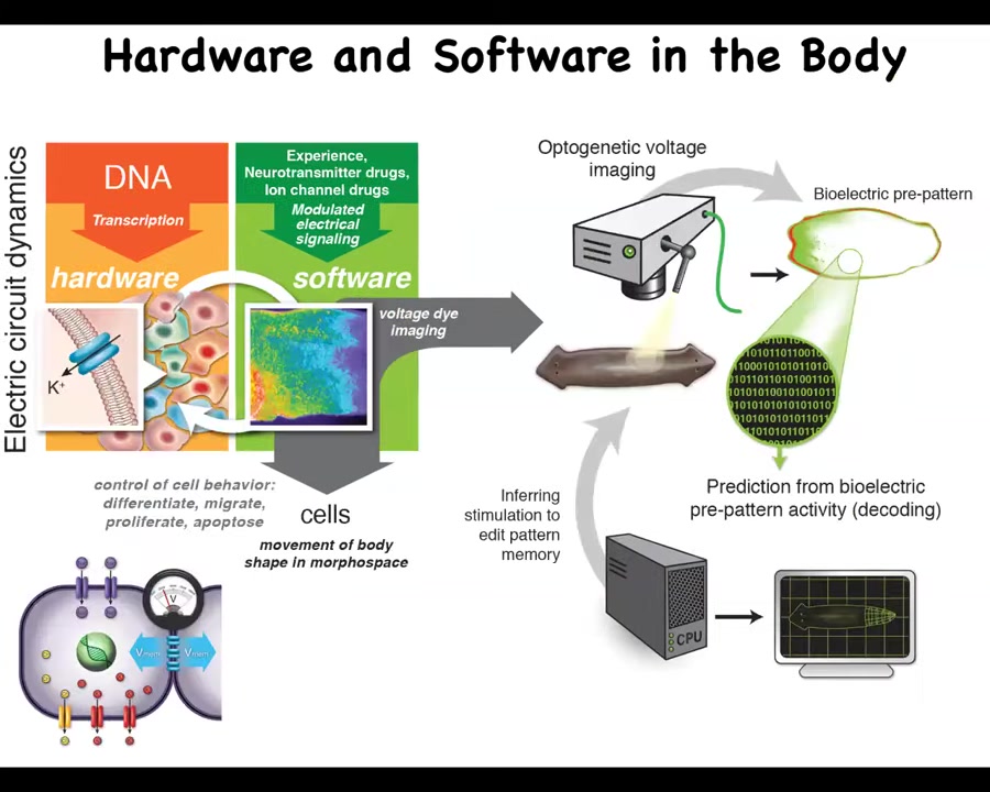 Now we know it's a memory because if you take these two-headed worms and you cut them in further rounds of amputation, plain water, no more manipulation of the bioelectrics. You don't do anything else other than keep cutting them. They will continue to form two-headed animals. We can turn them back into one-headed if we want to. But this has all the properties of memory. It's long-term stable. It's rewritable. It has conditional recall, which I just showed you a moment ago, and it has some discrete possible behaviors.