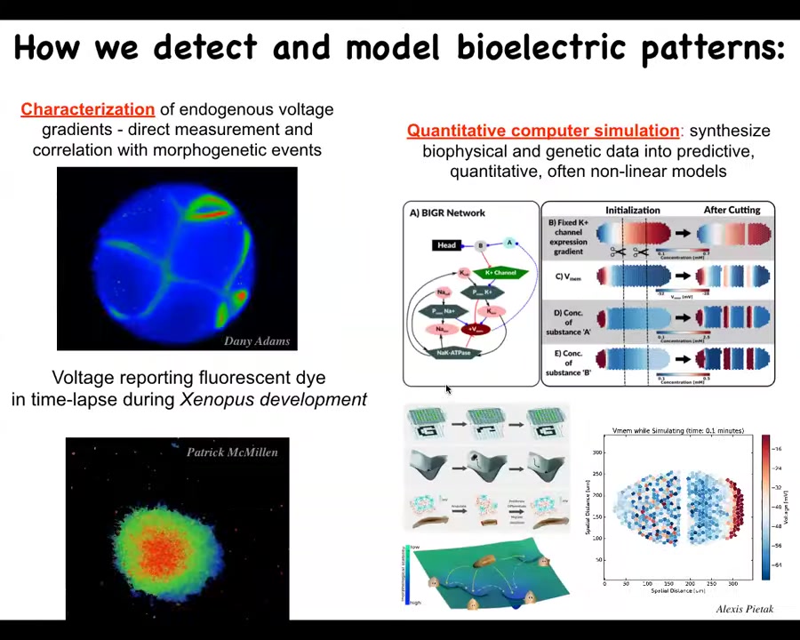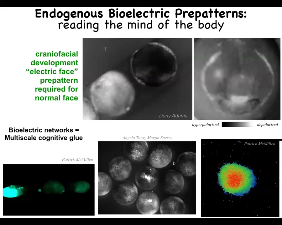 And so the first thing we've learned by this is that the bioelectric pattern is actually instructive. So that pattern is not just a readout of what's going on, but actually tells cells what to do. B. It's incredibly modular, meaning that we didn't say anything about which genes to turn on or how an eye is made, and we have no idea how to micromanage the creation of an eye. But what we did find is a high-level subroutine call. This is a hook, a minimal stimulus that, much like in behavior science, a simple stimulus can give rise to a very complex downstream set of behavioral responses. We said build an eye here, and that's what happens. The cells build an eye.